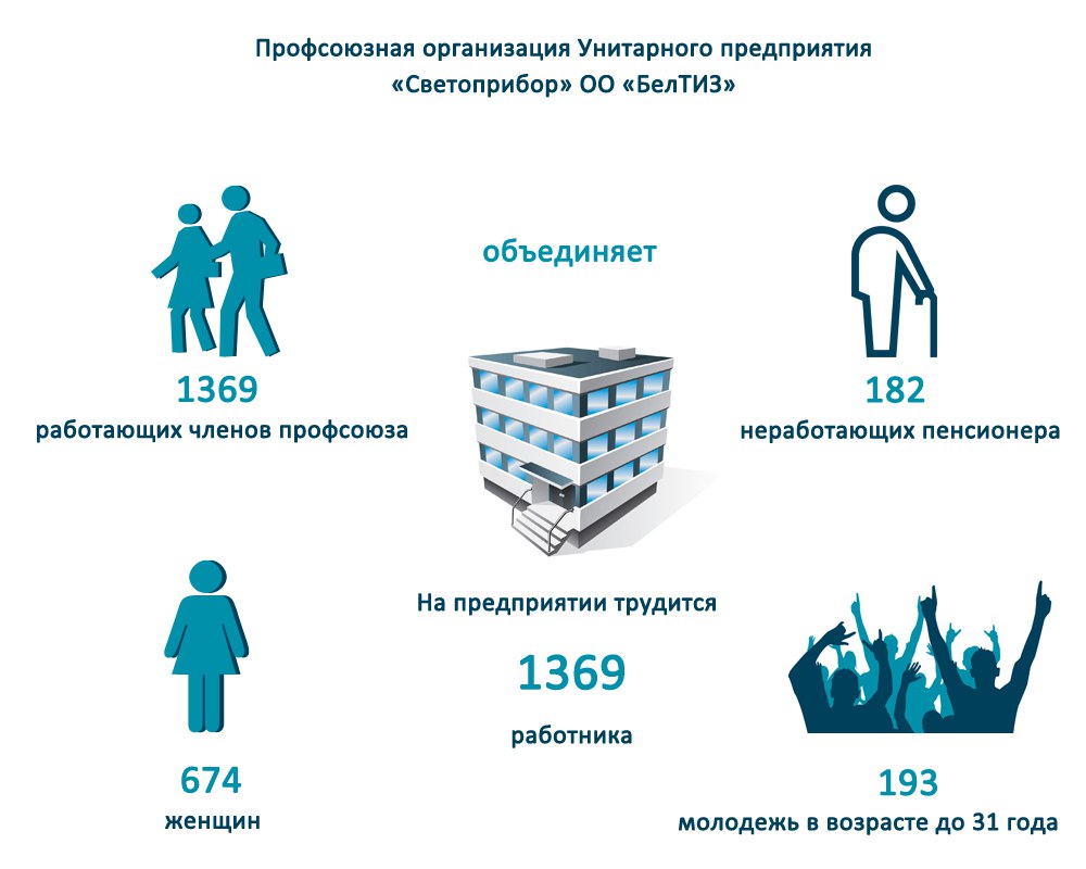 Охват профсоюзным членством работающих за последние три года: • На 01.01.2015 года - работающих 1477 человек, из них членов профсоюза - 1439 человек, процент охвата профсоюзным членством - 97,4%. • На 01.01.2016 года - работающих 1434 человек, из них членов профсоюза - 1404 человек, процент охвата профсоюзным членством - 98%. • На 01.01.2017 года - работающих 1369 человек, из них членов профсоюза - 1350 человек, процент охвата профсоюзным членством - 98,6%. Учетные карточки-заявления заполнены на всех членов профсоюза и подписаны каждым из них. Ежегодно проводится сверка членов профсоюза с наличием заведенных на них учетных карточек. Каждый вновь принятый работник ознакомлен с условиями коллективного договора, сдает учетную карточку в профком. Также имеются заявления на имя нанимателя на безналичное удержание членских профсоюзных взносов. В профкоме ведется статистическая отчетность в соответствии с инструкциями. Статистическая отчетность утверждается на заседании профкома и представляется в горком профсоюза. Чем выше эффективность нашей деятельности, тем выше доверие к профсоюзу со стороны работников. В современном мире наиболее востребованы профессионалы. И даже общественное поручение нужно выполнять профессионально. Профсоюзные работники, осуществляя защиту социально-трудовых прав членов профсоюза, опираются на законы и нормативные акты. Их нужно хорошо знать, уметь использовать в интересах работников. Получить такие знания помогает школа профсоюзного актива. При профкоме Унитарного предприятия «Светоприбор» ОО «БелТИЗ» создана школа профсоюзного актива. Весь профсоюзный актив Унитарного предприятия «Светоприбор» ОО «БелТИЗ» прошел обучение в школе профсоюзного актива: Председатели цеховых комитетов - 44; Профгруппорги – 12; Председатели комиссий профкомов, цехкомов – 36; Общественные инспекторы по охране труда – 128. Методический совет школы профсоюзного актива Унитарного предприятия «Светоприбор» ОО «БелТИЗ»: 1. Боровая Елена Викторовна – председатель 2. Калинин Всеволод Владимирович 3. Чугай Татьяна Ивановна 4. Неверовская Диана Владимировна